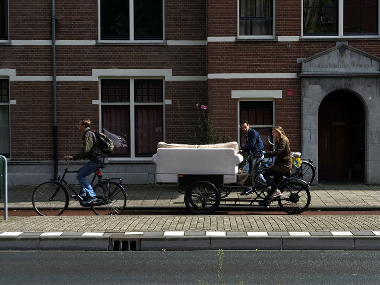 Bicycles are used for everything in Amsterdam. Here, a young lady transports a sofa on sort of a bike trailer.