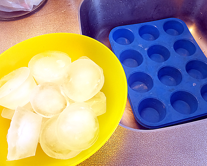 We take ice for granted but it is not a common thing in Europe. Before we bought our own ice trays, we used a flexible muffin pan to make “Ice Muffins.”