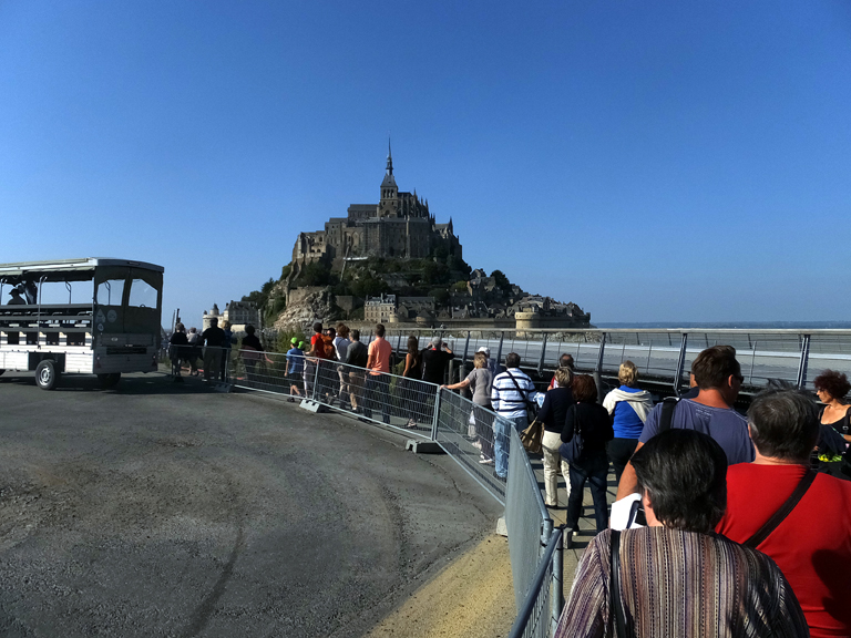 Visitors to Mont Saint-Michel see it first from miles away as a small mountain looming above a coastal plain — some of the flattest terrain in France. This is a telephoto view from the visitors parking lot a mile-and-a-half from the island.