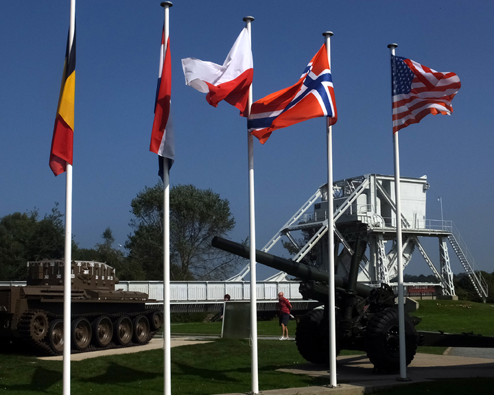 Pegasus Bridge, site of the first casualties on D-Day. It is no longer in use but has been reassembled near the original site and restored as a memorial. The British squadron that captured and held this critical bridge had landed silently in three 30-man gliders and took the Nazis by surprise. After the war the bridge was renamed “Pegasus” because that was the insignia on their uniforms. The flags of every nation that participated in the D-Day invasion are flown.