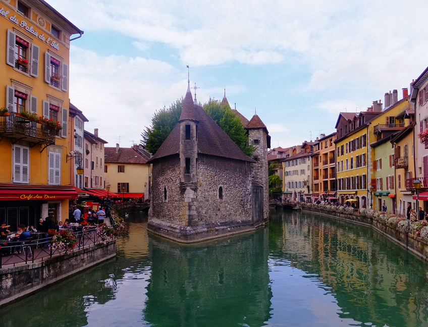 Annecy is located on Lake Annecy, near Geneva, Switzerland. It is bisected by the Thiou River. In the middle of the river, the Palais d’Isle was originally the home of the Lord of Annecy. Since then it has served as a courthouse, a mint, and a prison.