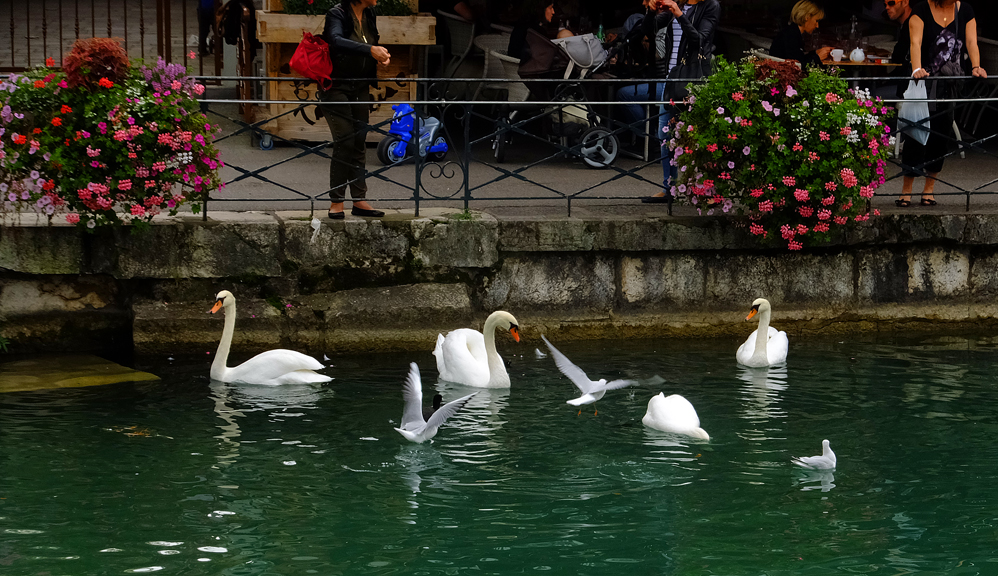 Feeding the numerous swans – and the faster interlopers – is a popular activity in Annecy.