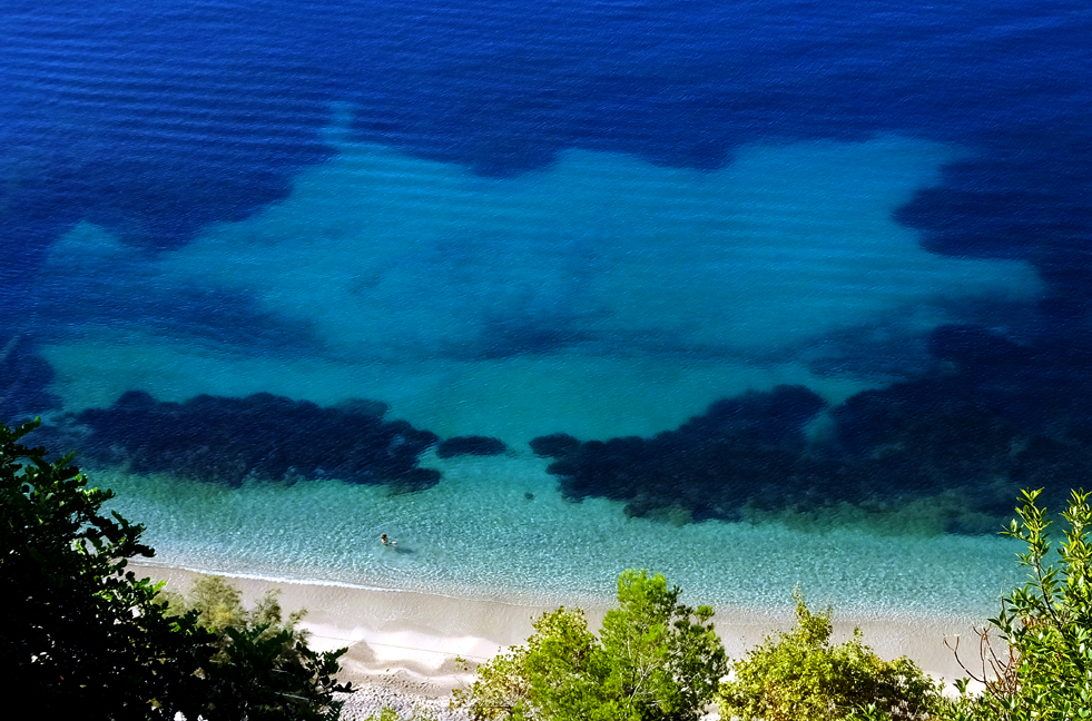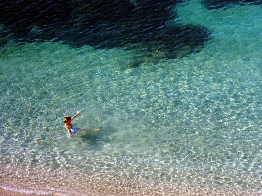 The high hills let you look down to this inviting beach. If you look closely, you can just make out the tiny figure of a person in the water.