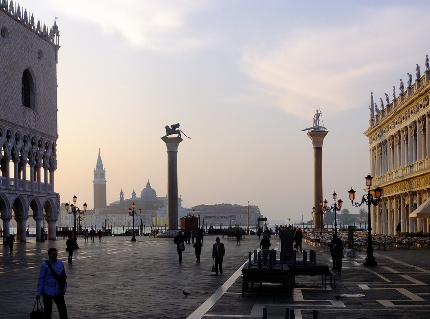 The Piazza San Marcos was nearly deserted at first light. By 10:00 it was crowded with tourists. It remained so into the evening, when competing orchestras entertain diners at sidewalk cafes.