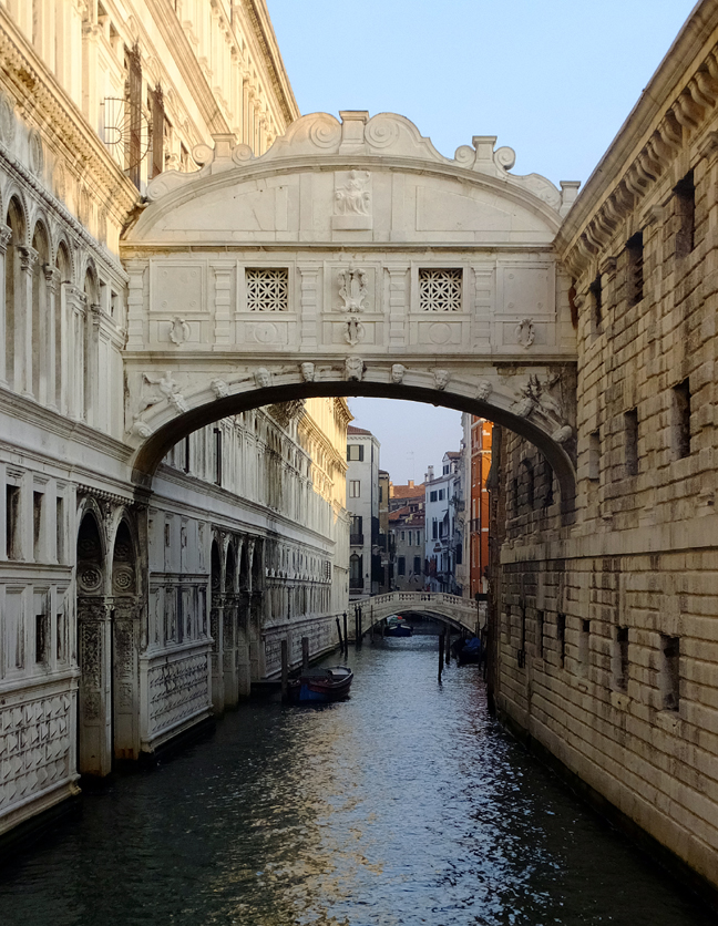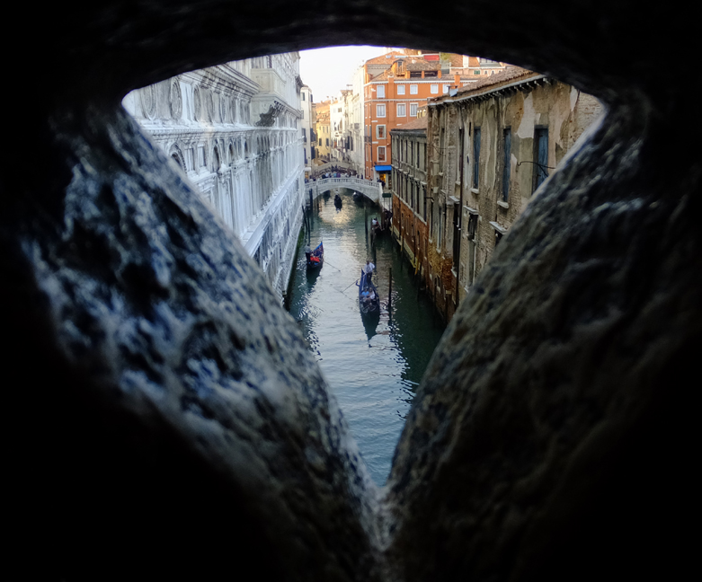 This view through one of the window grates in the “Bridge of Sighs” would have been a prisoner’s last glimpse of the city. It’s easy to see how the condemned might sigh heavily, giving the bridge its name.