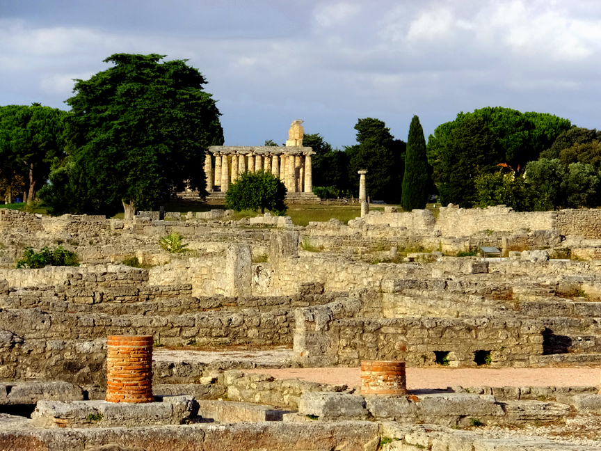 Among the major reasons we planned a week in the Italian region of Campania was the desire to see some of the world’s best-preserved examples of ancient life. Most people have heard of Pompeii and Herculaneum, the towns buried and preserved in volcanic ash. The Naples National Archaeological Museum contains the best of the art and artifacts recovered from these and other sites. Less well-known is Paestum, an ancient outpost of Magna Graecia that survived the centuries relatively intact, without the “benefit” of volcanic ash.