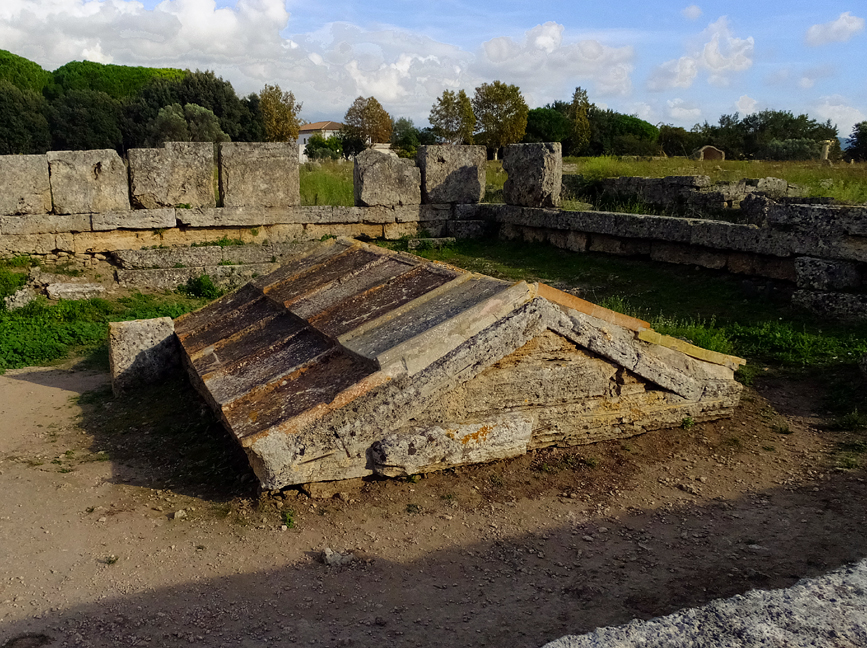 Although most of Poseidonia was obliterated when the Romans conquered it, this roof top was part of a grave enclosure built by the Romans to preserve a Greek grave. Turns out the Romans were superstitious about disturbing graves. So they just built an enclosure around it, and kept on going.